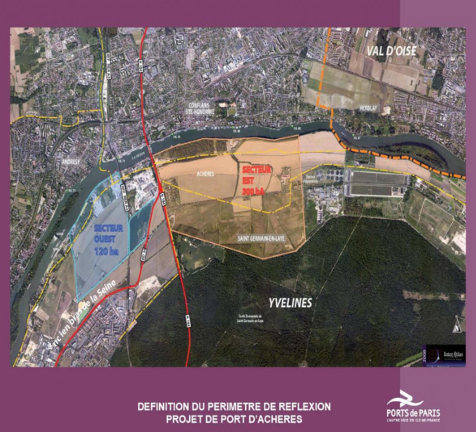 Aujourd’hui, le projet local de la ville est la reconquête de son sol et l’obtention d’une façade fluviale dont elle a été jusque là largement dépossédée par le rachat des terrains à la ville de Paris grâce aux bénéfices tirés de l’extraction des granulats fluviaux. Reste que la plaine dans son étendue représente un atout dont plusieurs souhaite bénéficier. EDF voulut y faire passer des lignes à haute tension ; la région, une voie à fort trafic et l’État y a l’ambition de rattacher Paris à la mer. Ce vaste port fluvial aurait une double vocation. Dans un premier temps, Achères et son port permettrait la distribution fluviale des sables et graviers de construction, assurant pour des décennies l’autonomie de la région parisienne en matériau de construction. Dans un deuxième temps, et à l’échelle du Nord de l’Europe cette fois, elle offrirait une vaste plateforme logistique reliée à tous les modes de transports où seraient apportés quantités de matériaux manufacturés ou en vrac. Cela dit, Paris, EDF ou l’Etat ne sont par les seuls à s’inviter à cette prise de possession du territoire. Le Paris-Saint-Germain Football Club, propriété qatarie, se propose d’y implanter son nouveau centre d’entraînement. Mais le PSG viendra-t-il ? On sait par expérience que de tels effets d’annonce prépare un terrain à l’urbanisation quitte à oublier, quand il se construit, ses premières justifications.