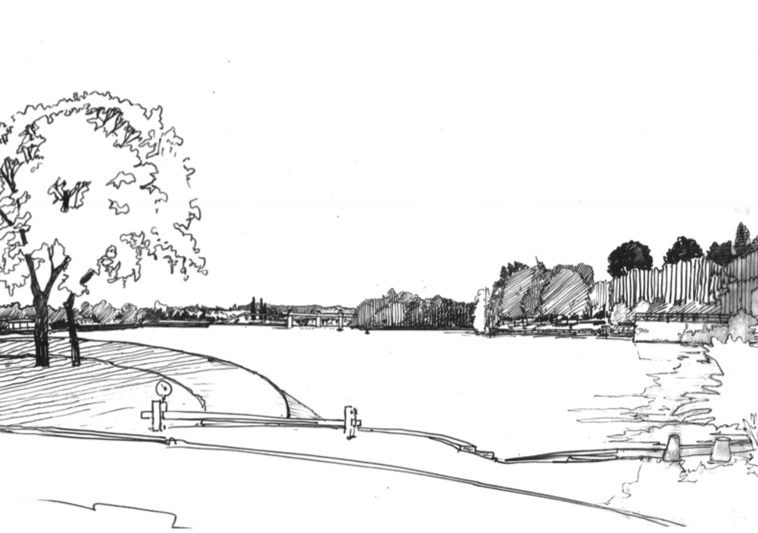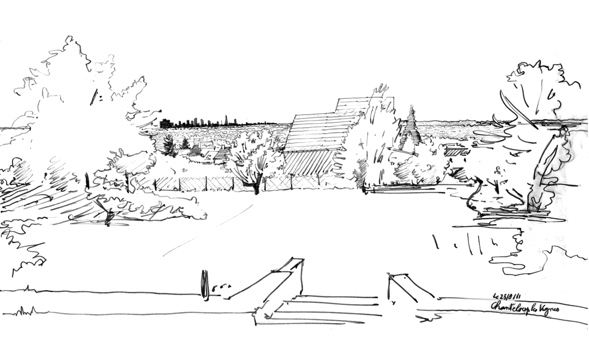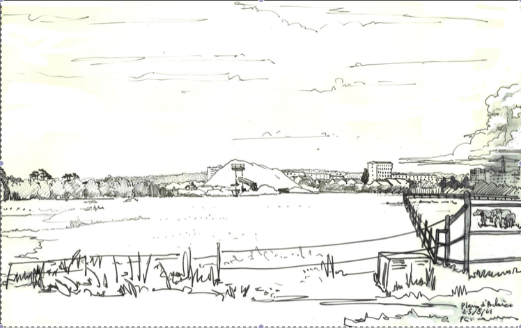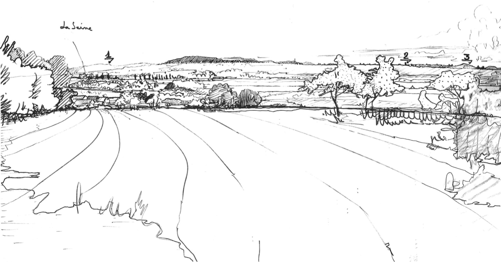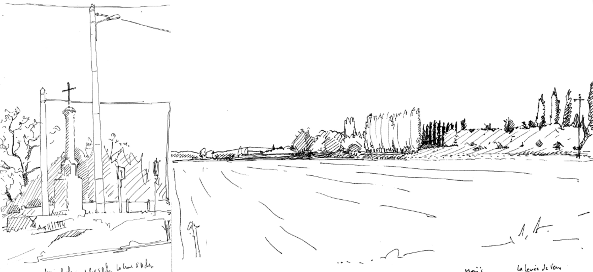 Quatrièmement, l’entre-deux est un lieu de pratiques non programmées, parfois déviantes mais tolérées tant qu’elles restent discrètes. Il convient donc là aussi de les observer et d’en faire l’inventaire. Souvent temporaire, elles peuvent cependant être en partie reprises dans un projet global si celui-ci, par le biais de la concertation, est en mesure d’intégrer l’inventivité du « projet local ». À cet égard, il faut utiliser, et si possible inventer, différents moyens de connaissance d’un site et de ses acteurs, ainsi que différents moyens de communication. A priori, nuls ne sont à écarter : films, jeux de rôles, voire roman-photos qui mettent en scène les personnes concernées par le devenir de leur territoire. Le recours au dessin « traditionnel », et en particulier au croquis réalisé rapidement in situ, fait partie de ces moyens de connaissance et de communication. Cadrage, lieu et moment de réalisation sont autant d’éléments et de choix qui en font un outil efficace de lecture analytique de l’espace, comme en témoignent ceux réalisés depuis plusieurs années dans la plaine d’Achères.