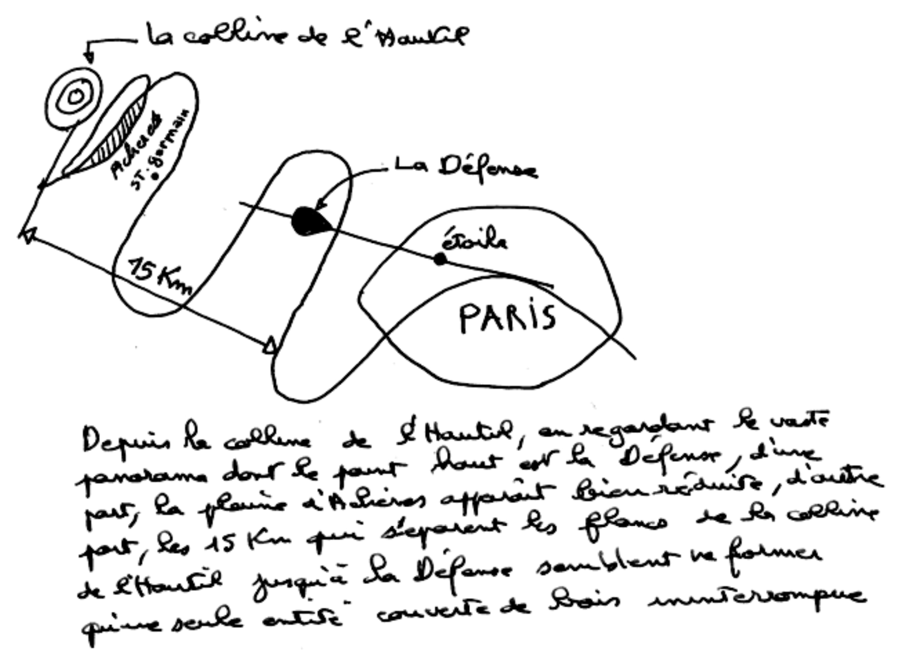 Avant d’aborder la question des entre-deux à partir des spécificités d’Achères, il est opportun, de prendre de la hauteur pour regarder la plaine et en comprendre la structure et le paysage. Depuis le point culminant de la Région parisienne qu’est le mont Hautil, on embrasse un vaste paysage de collines et de forêts dont les frondaisons cèdent progressivement la place à un tapis continu de constructions de tous ordres (Figure 2). Dominant la myriade de toits et de terrasses, quelques monuments sont parfaitement reconnaissables (le Sacré-Cœur et la Tour Eiffel) ; d’autres se dessinent moins nettement (la tour Montparnasse, celle de la Plaine Saint-Denis ou de la porte de Pantin). Le spectacle le plus impressionnant reste celui offert par le bouquet des tours de la Défense notamment parce qu’entre le premier plan et ces tours, la plaine d’Achères est complètement escamotée : on ne la voit plus. La forêt de Saint-Germain prend alors la forme d’un très vaste parterre sur lequel est posée cette floraison de béton, d’acier et de verre (Figure 3). Curieux effet de raccourcis, la forêt de Saint-Germain mêlant ses branches à d’autres bois dresse un écran masquant l’ensemble des méandres de la Seine et, comme aucune construction haute n’émerge de ce grand parterre, les 14 kilomètres séparant l’Hautil de la Défense, forment un tout.