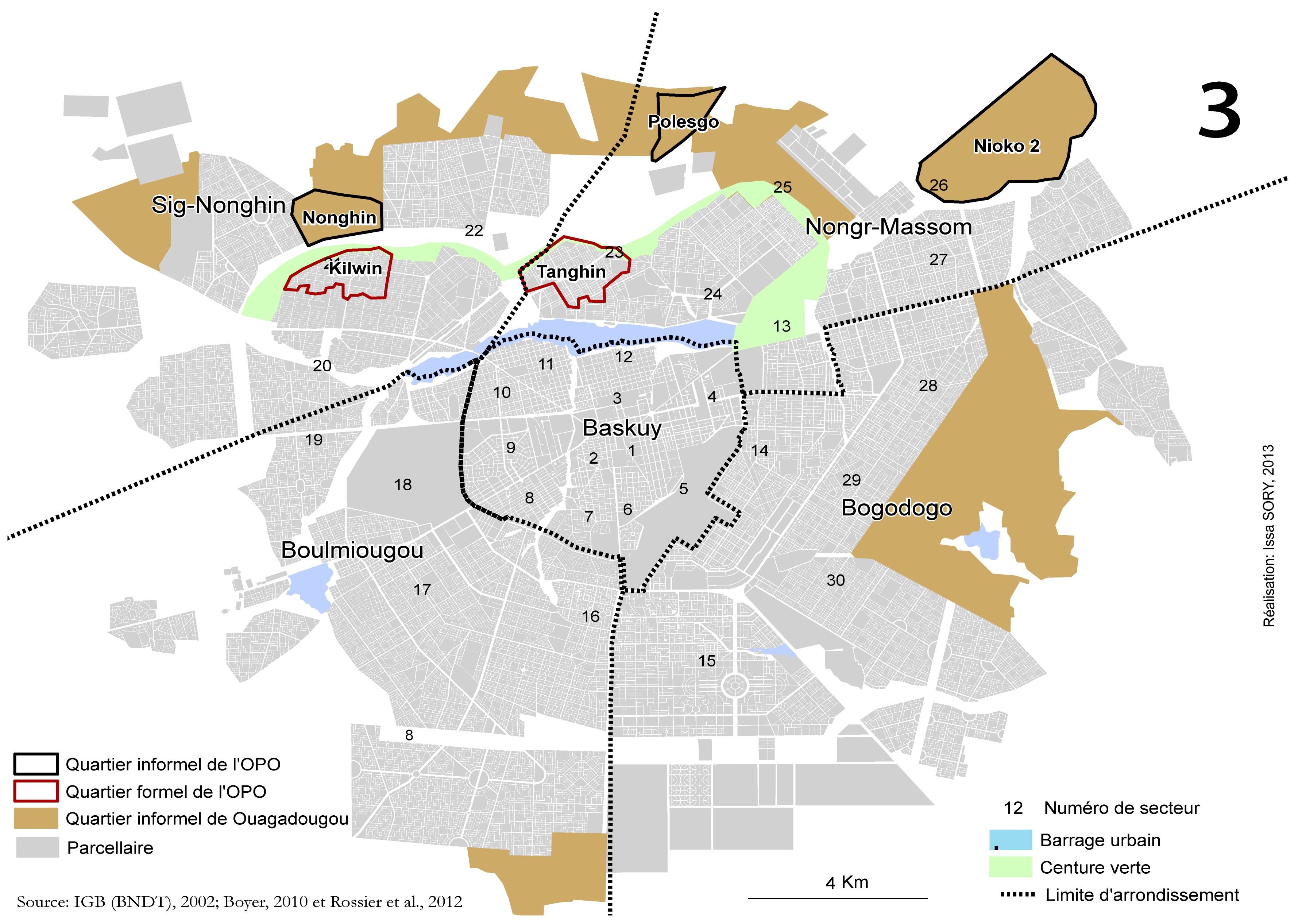 Le statut juridique des quartiers informels de Ouagadougou explique leur marginalisation sur le plan des services publics urbains, puisque ces derniers sont réservés en priorité aux quartiers lotis. Les pratiques (coutumières) des acteurs de ces quartiers, tacitement acceptées, contribuent donc à en faire des marges. Cependant, ces pratiques visent également à s’affranchir de ce caractère marginal, avec l’intervention des autorités politiques chargées de lotir ces quartiers.