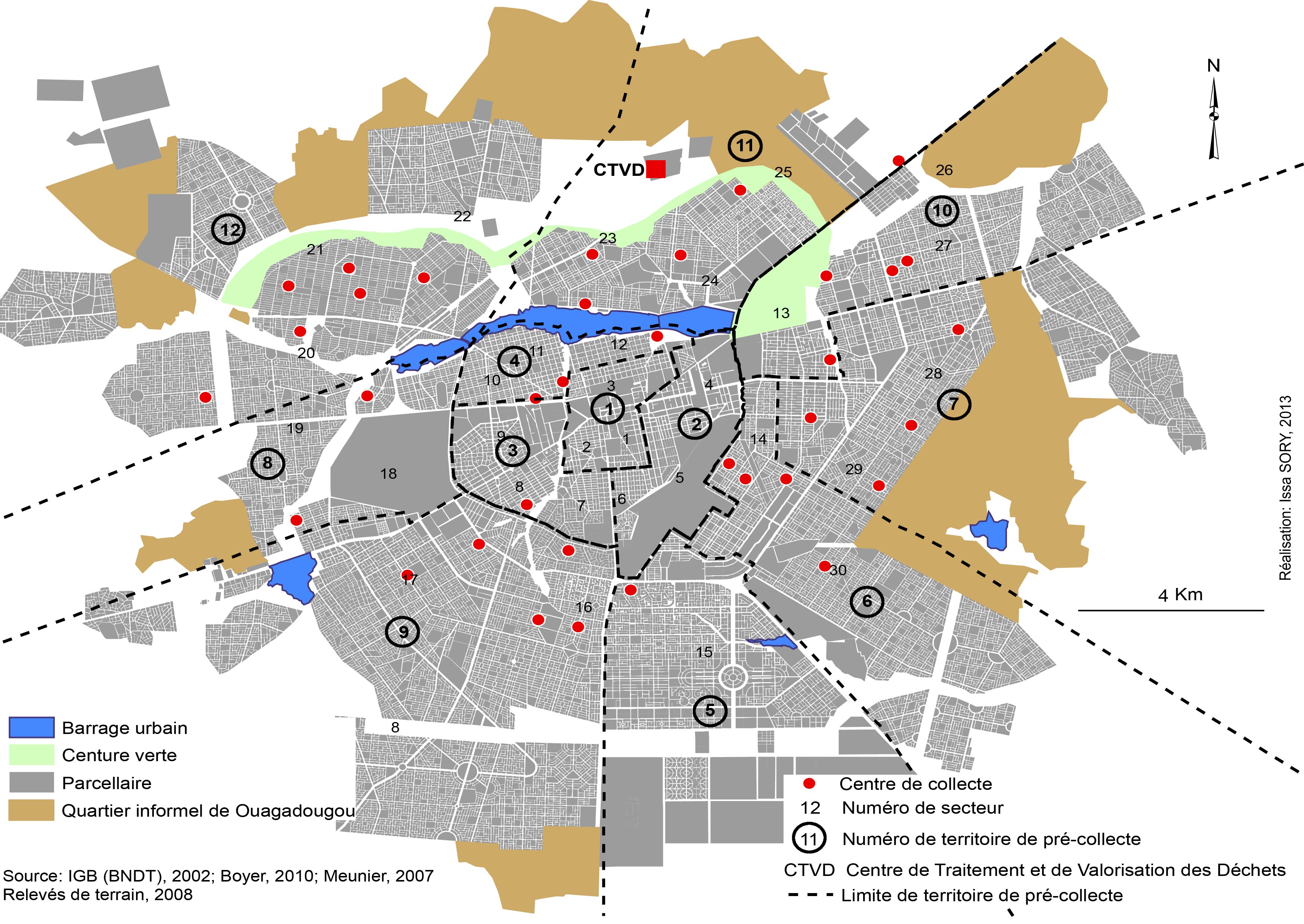 L’analyse de la collecte des déchets vient corroborer ces résultats. Au Burkina Faso, l’organisation de la filière des déchets a toujours été du ressort de l’Etat – soit directement, soit à travers des opérateurs privés – de 1960 à la fin des années 1980. Mais avec la décentralisation des années 1990, la pré-collecte, la collecte et l’élimination des déchets relèvent de la compétence des collectivités locales. En conséquence, des acteurs privés ont fait leur apparition dans la filière pour se substituer à l’Office National des Services d’Entretien de Nettoyage et d’embellissement (ONASENE) qui sera « liquidé » en 1996. Cet office, créé en 1988, avait le monopole de la gestion des déchets sur toute l’étendue du territoire national. Pour organiser les pré-collecteurs et collecteurs privés, les autorités municipales, avec le soutien de la Banque mondiale, ont élaboré un Schéma Directeur de Gestion des Déchets (SDGD) en 2000. Avec l’application de ce schéma, à partir de 2005, Ouagadougou a été subdivisée en douze territoires de pré-collecte qui ont été attribués, suite à un appel d’offres, aux Petites et Moyennes Entreprises (PME) et Groupements d’Intérêt Economique (GIE). Des infrastructures de collecte tels que les centres de collecte – interface entre la pré-collecte et la collecte – et un centre final appelé Centre de Traitement et de valorisation des Déchets (CTVD) ont été construites. Les déchets sont pré-collectés au porte-à-porte et déposés dans les bacs à ordures disposés dans les centres de collecte. Ensuite, la mairie et l’entreprise privée EBTE (Entreprise Burkinabé des Travaux d’Équipements) procède au transport des bacs à ordures des centres de collecte au CTVD. Enfin, dans ce centre, l’enfouissement est l’effectué par une entreprise dénommée « Entreprise de Construction de l'Habitat ».