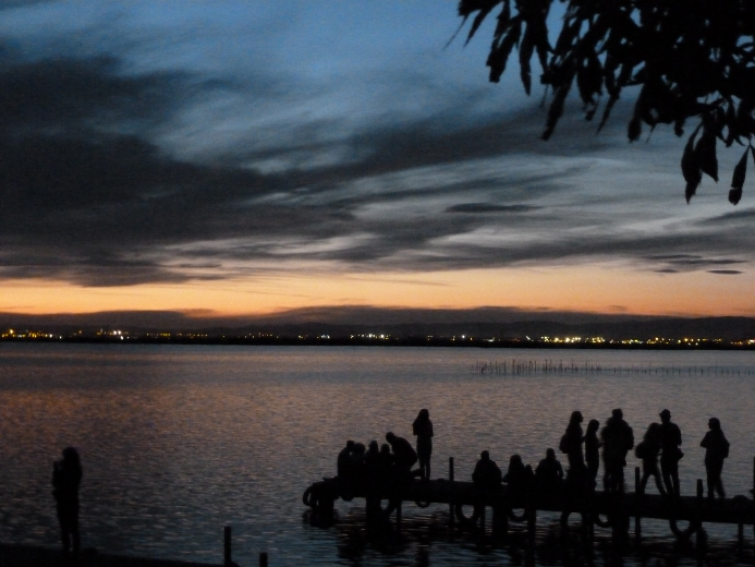 On aperçoit au second plan les filets de pêche à l’anguille et au fond les lumières de la rive ouest de la lagune, très urbanisée.