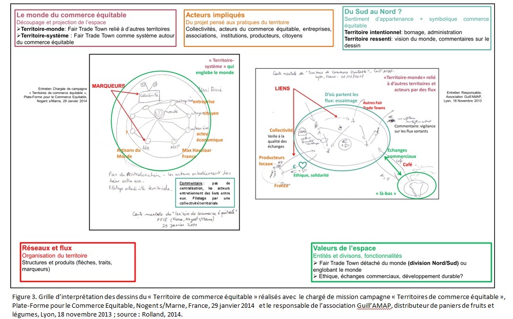 Deux lectures du territoire apparaissent. L’une exprime des valeurs, des idéaux, de l’ordre de l’intime, relatifs au commerce équitable à , l’autre illustre des éléments d’un territoire perçu dans sa dimension collective. Les dessins révèlent à la fois un territoire intentionnel (administration, drapeau, collectivité nommée et délimitée) et un territoire ressenti relevant des symboliques spatiales du commerce équitable (cœurs, échanges Nord Sud, liens entre acteurs).